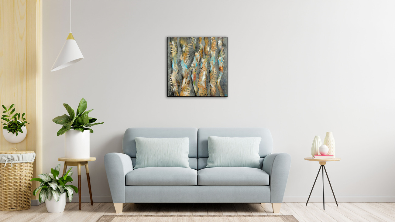 - Technique : Collage, feuille d’or et peinture acrylique sur toile