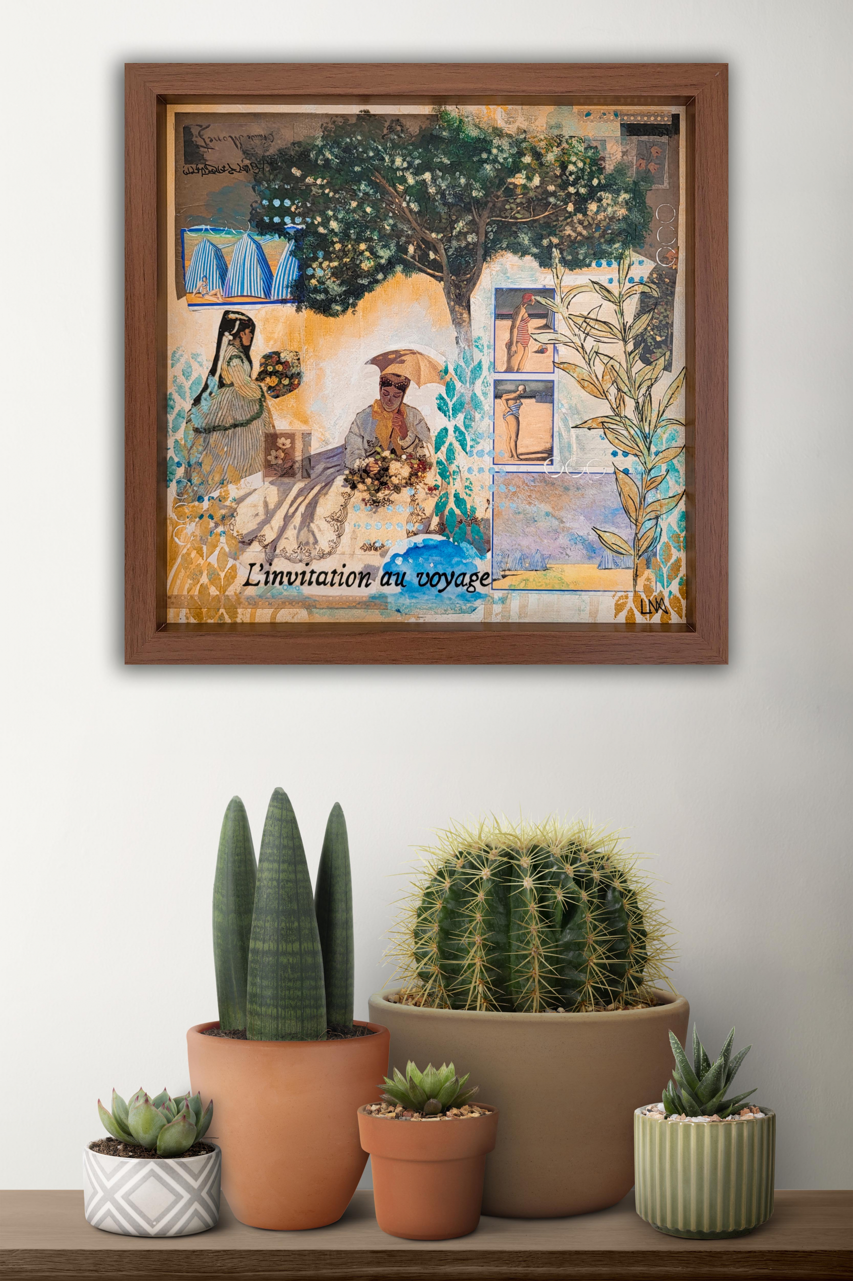 Ce collage sur carton entoilé tisse des souvenirs de vacances et d’instants suspendus, où la nature et la rêverie se confondent.