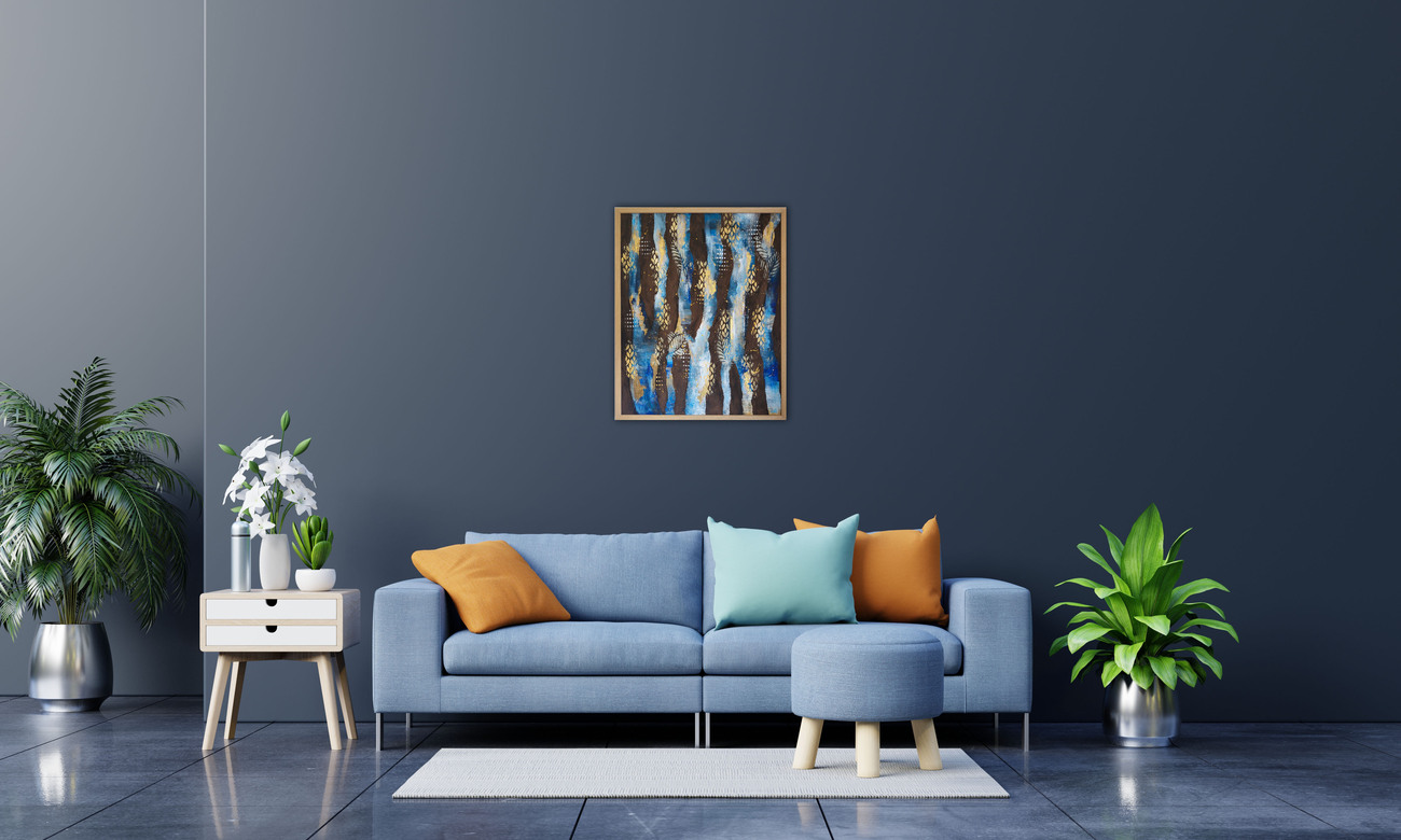 Dans cette forêt-là, les troncs sont terre — bruns, denses, enracinés dans quelque chose d’ancien. Mais entre eux, le ciel s’est glissé. Bleu vif, bleu profond, bleu qui pulse comme une respiration. Et peu à peu, on ne sait plus très bien ce qui est tronc et ce qui est ciel. Ce qui tient debout et ce qui s’envole.