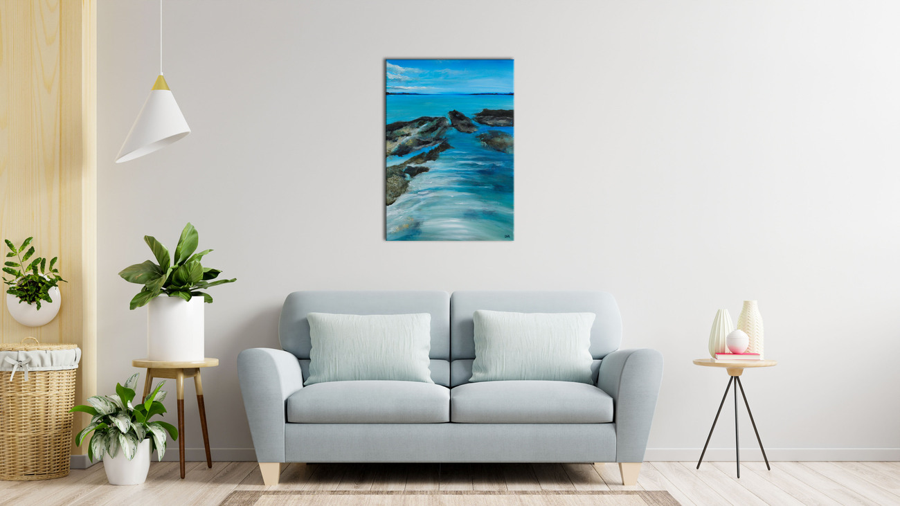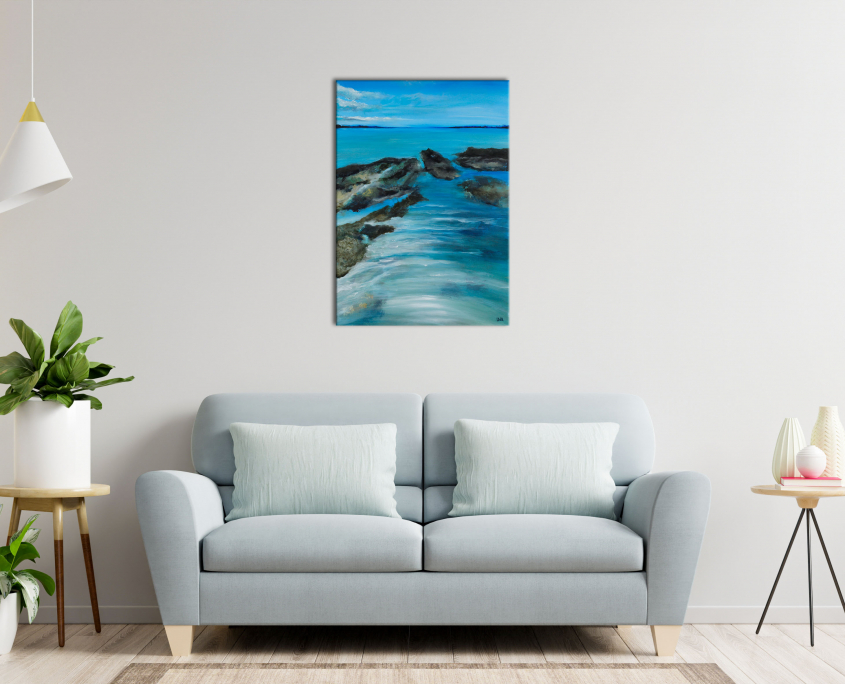 Cette peinture évoque le plaisir simple d’être là, de sentir l’espace sous ses pas, de se laisser traverser par la lumière et le mouvement. Marée basse parle d’apaisement, d’ouverture, et de cette respiration intérieure que seule la mer sait offrir lorsque tout se retire pour laisser place à l’essentiel.