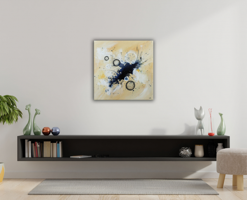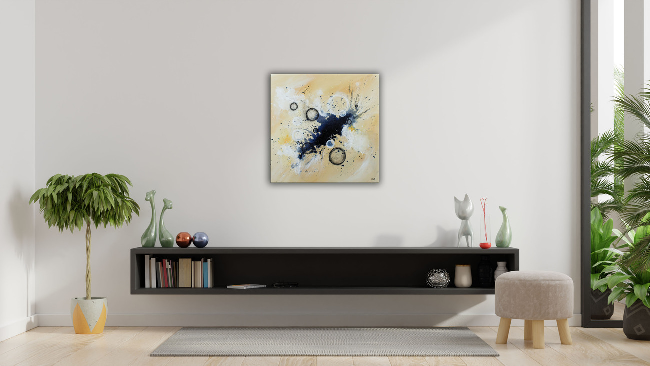Dans des nuances de jaune lumineux et de gris de Payne, Mémoire stellaire évoque un espace suspendu entre ciel et matière. Les couches se superposent comme des strates de souvenirs anciens, des mémoires inscrites au-delà du temps, quelque part entre l’intime et le cosmique.